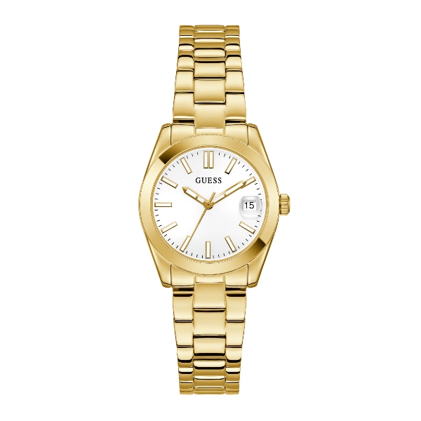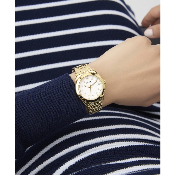 Buy It NowΓυναικείο ρολόι GUESS ALICE GW0934L2 διαμέτρου 32mm, με μηχανισμό QUARTZ ακριβείας, λευκό καντράν, κάσα και μπρασελέ από ανακυκλωμένο ατσάλι.