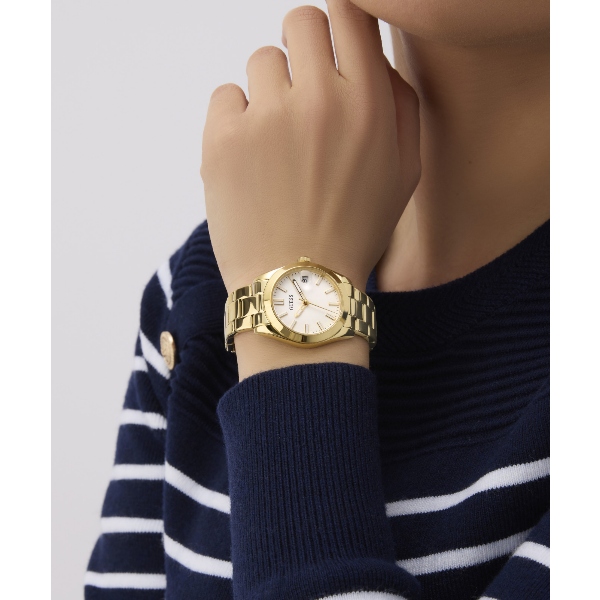 Γυναικείο ρολόι διαμέτρου 32mm με μηχανισμό QUARTZ ακριβείας. Έχει λευκό καντράν με χρυσούς δείκτες και λεπτομέρειες και έχει ένδειξη ημερομηνίας. Η κάσα του είναι από ανακυκλωμένο ατσάλι με κρύσταλλο από ορυκτό κρύσταλλο ειδικής σκλήρυνσης. Έχει μπρασελέ από ανακυκλωμένο ατσάλι και κούμπωμα ασφαλείας. Δεν είναι αδιάβροχο.