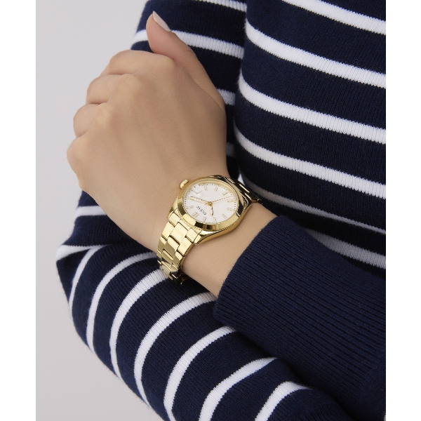 Γυναικείο ρολόι GUESS ALICE GW0934L2 διαμέτρου 32mm, με μηχανισμό QUARTZ ακριβείας, λευκό καντράν, κάσα και μπρασελέ από ανακυκλωμένο ατσάλι.