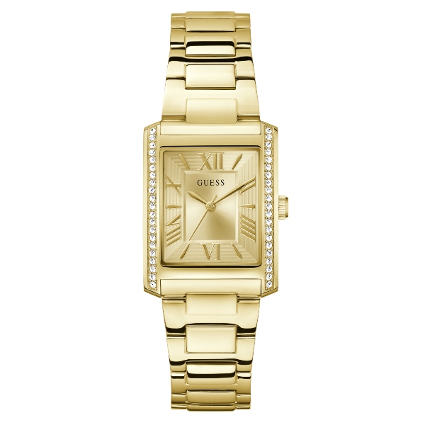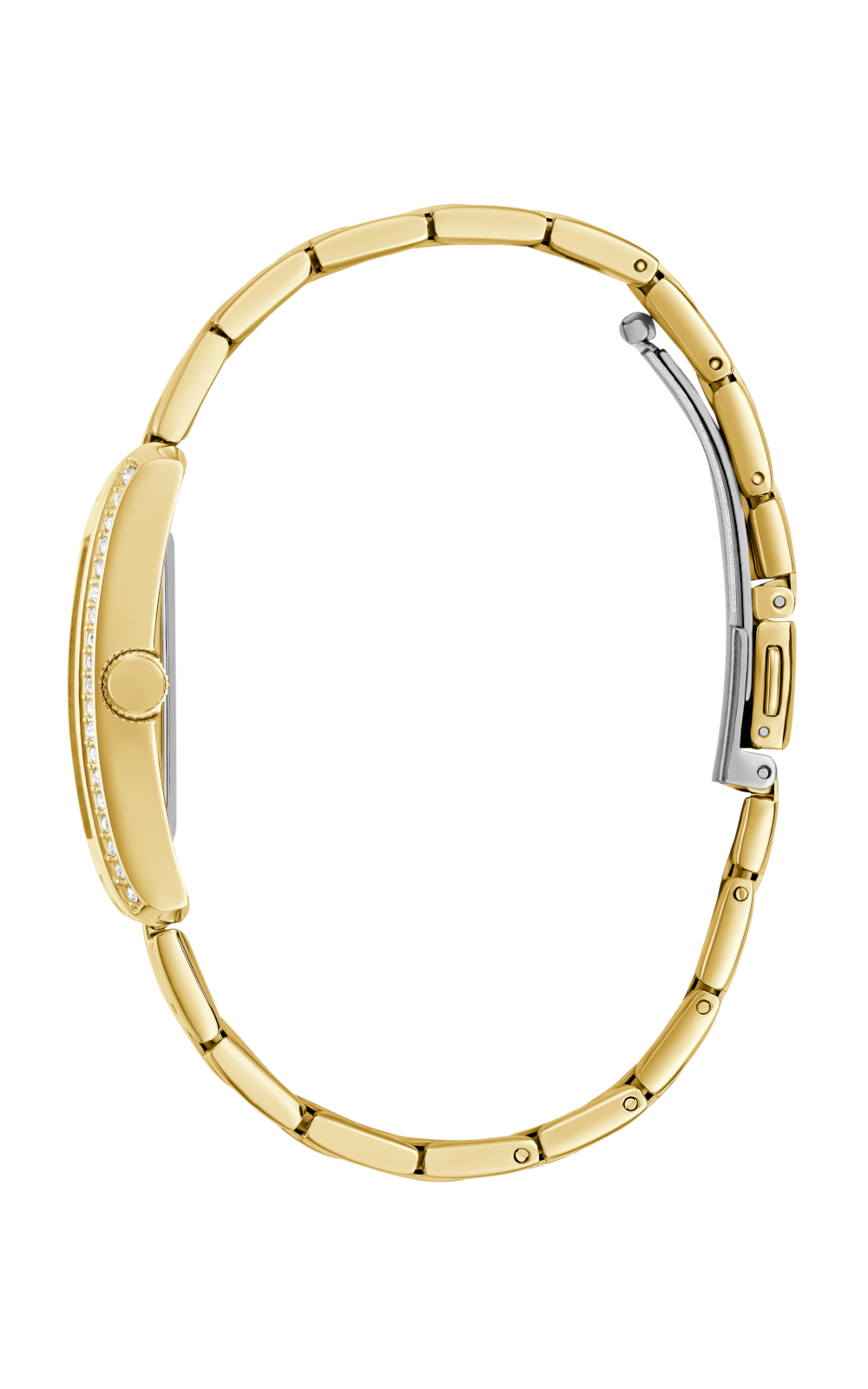 Γυναικείο ρολόι διαμέτρου 27mm με μηχανισμό QUARTZ ακριβείας. Έχει χρυσό καντράν και χρυσούς δείκτες. Η κάσα του είναι από ανακυκλωμένο ατσάλι χρυσού χρώματος με κρύσταλλο από ορυκτό κρύσταλλο ειδικής σκλήρυνσης και πέτρες. Έχει χρυσό μπρασελέ από ανακυκλωμένο ατσάλι και κούμπωμα ασφαλείας. Δεν είναι αδιάβροχο.