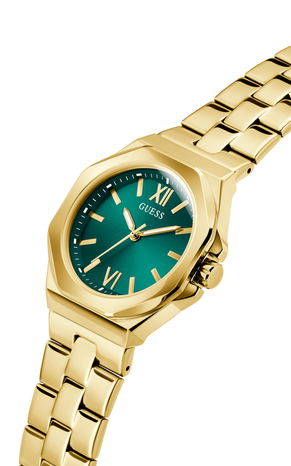 Γυναικείο ρολόι GUESS EMPRESS GW0873L2 διαμέτρου 34mm, με μηχανισμό QUARTZ ακριβείας, πράσινο καντράν, κάσα και μπρασελέ από ανακυκλωμένο ατσάλι.