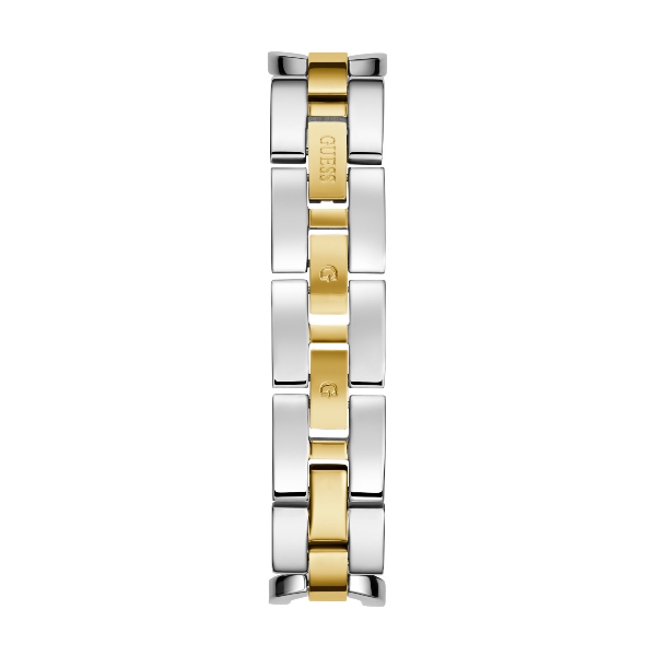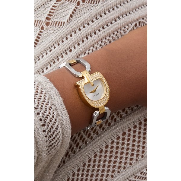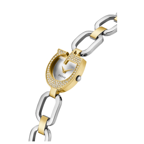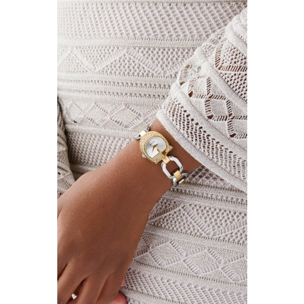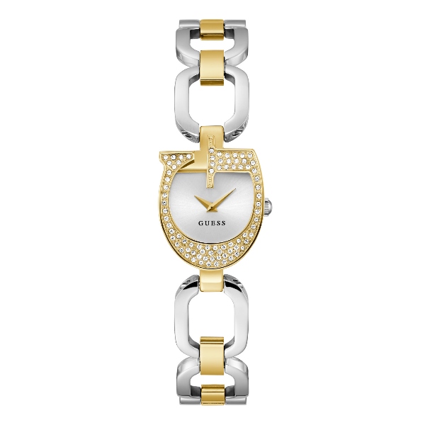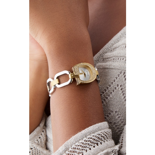 Γυναικείο ρολόι διαμέτρου 22mm με μηχανισμό QUARTZ ακριβείας. Έχει ασημένιο καντράν και χρυσούς δείκτες . Η κάσα του είναι από ανακυκλωμένο ατσάλι σε χρώμα χρυσό με λεπτομέρειες, διακοσμημένη με κρυστάλλα και κρύσταλλο από ορυκτό κρύσταλλο ειδικής σκλήρυνσης. Έχει ασημένιο και χρύσο μπρασελέ από ανακυκλωμένο ατσάλι και κούμπωμα G-Link. Δεν είναι αδιάβροχο.