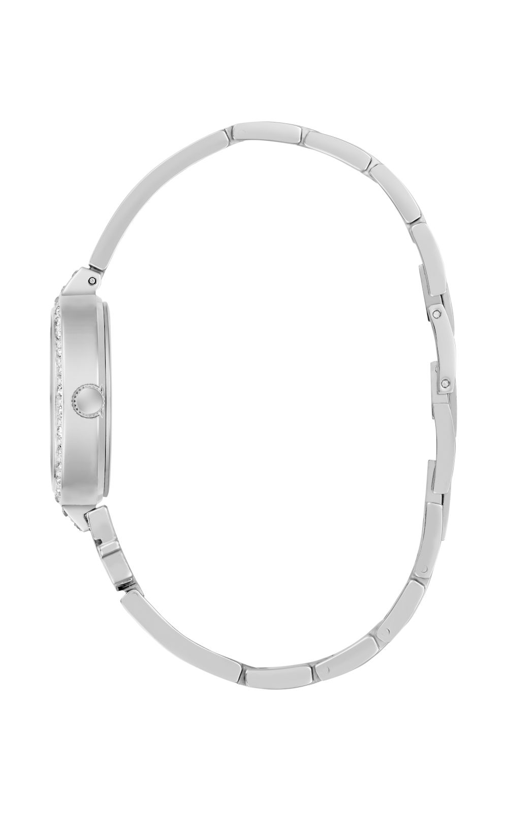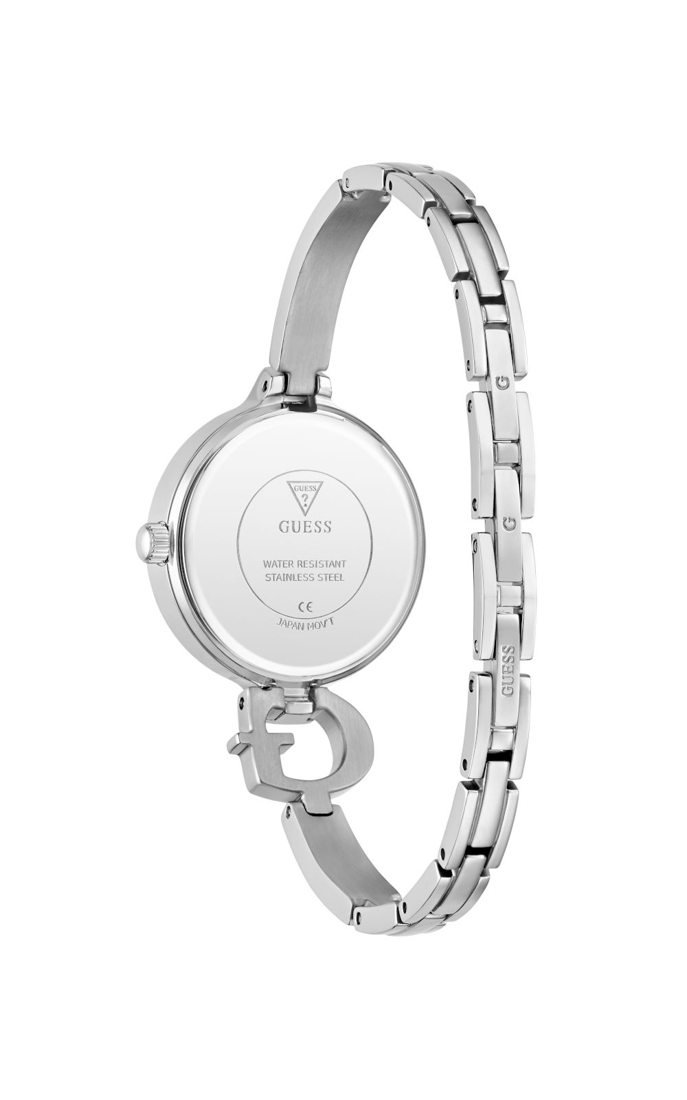Γυναικείο ρολόι διαμέτρου 28mm με μηχανισμό QUARTZ ακριβείας. Έχει ασημένιο καντράν με ασημένιους δείκτες και λεπτομέρειες και είναι διακοσμημένο με πέτρες. Η κάσα του είναι από ανακυκλωμένο ατσάλι με κρύσταλλο από ορυκτό κρύσταλλο ειδικής σκλήρυνσης. Έχει μπρασελέ από ανακυκλωμένο ατσάλι και κούμπωμα G-Link.