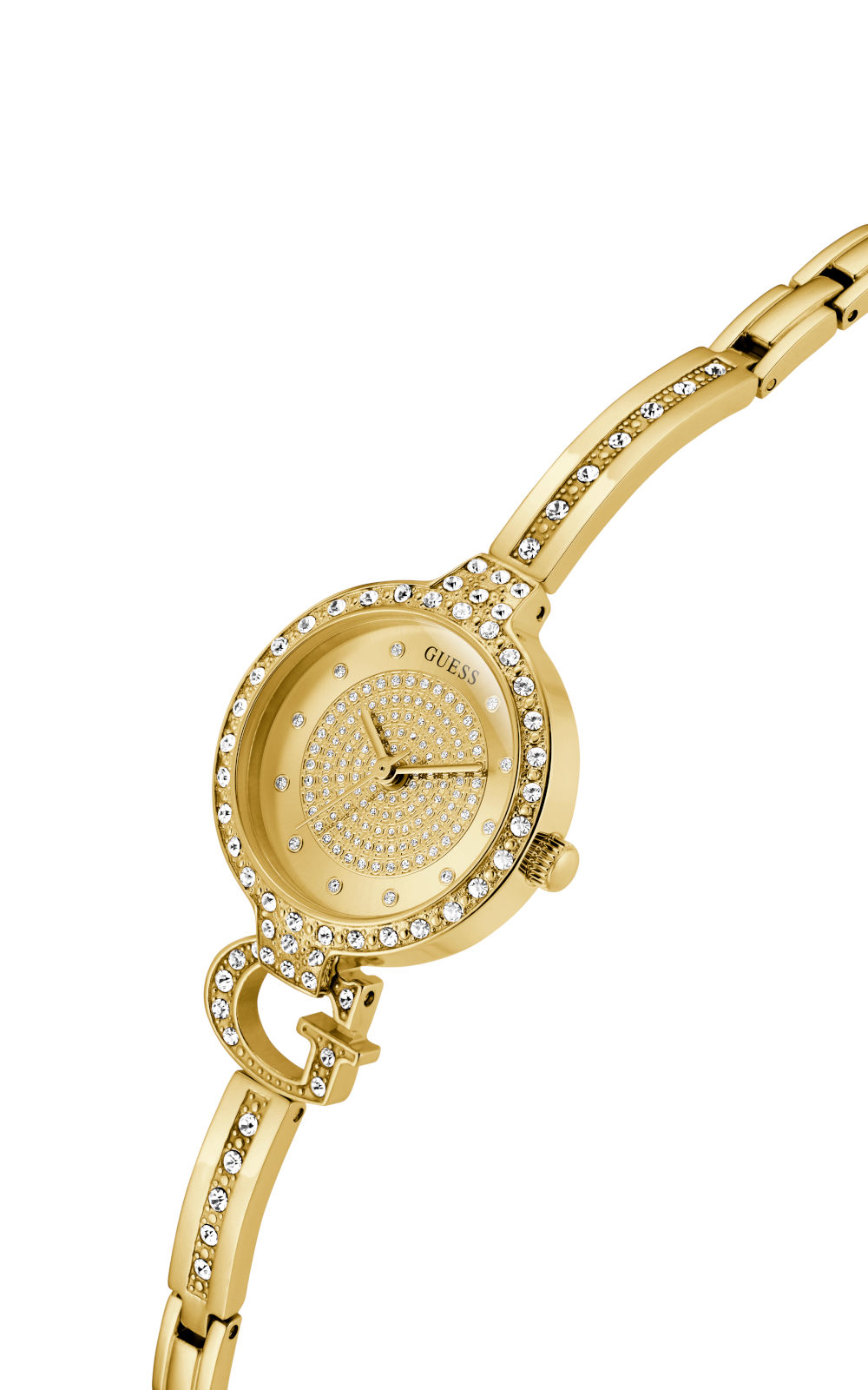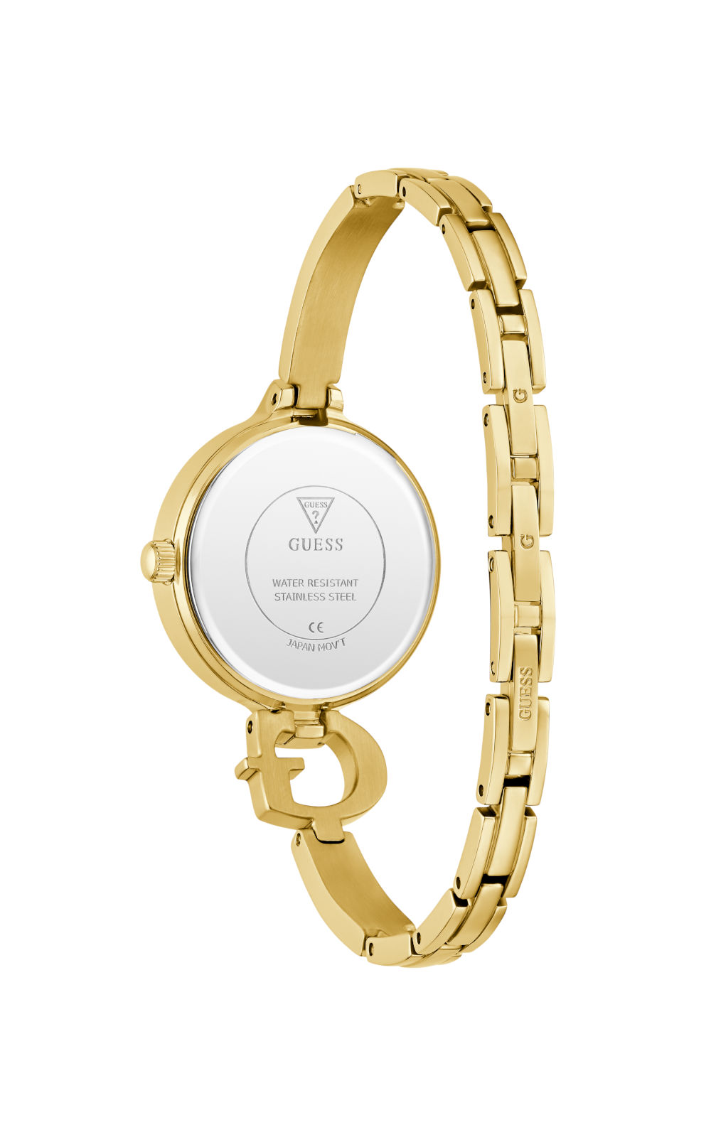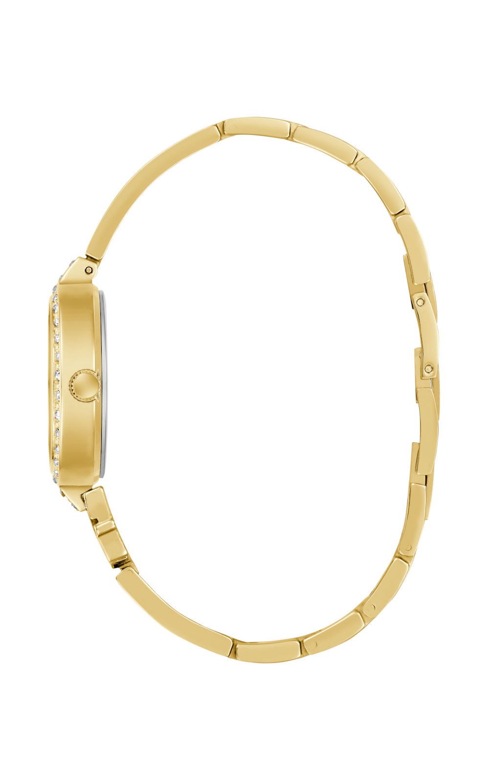 Γυναικείο ρολόι διαμέτρου 28mm με μηχανισμό QUARTZ ακριβείας. Έχει χρυσό καντράν με χρυσούς δείκτες και λεπτομέρειες και είναι διακοσμημένο με πέτρες. Η κάσα του είναι από ανακυκλωμένο ατσάλι με κρύσταλλο από ορυκτό κρύσταλλο ειδικής σκλήρυνσης. Έχει μπρασελέ από ανακυκλωμένο ατσάλι και κούμπωμα G-Link.