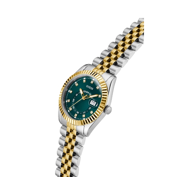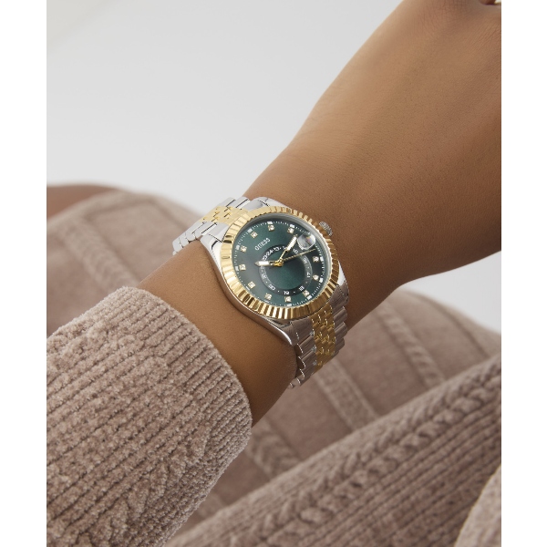 Γυναικείο ρολόι GUESS JADA GW0936L3 διαμέτρου 34mm, με μηχανισμό QUARTZ Multifuction ακριβείας, πράσινο καντράν, κάσα και μπρασελέ από ανακυκλωμένο ατσάλι.