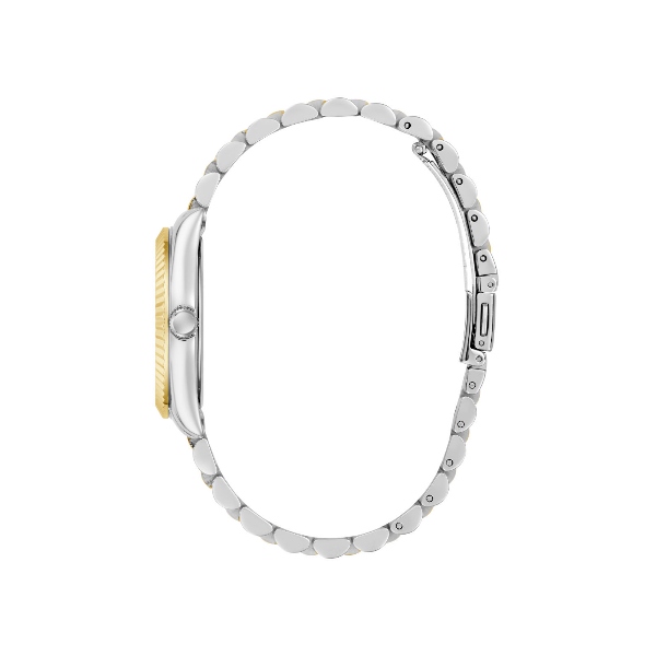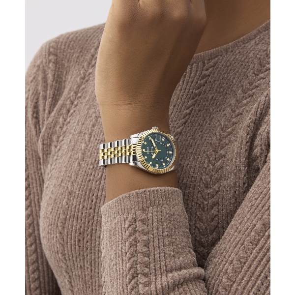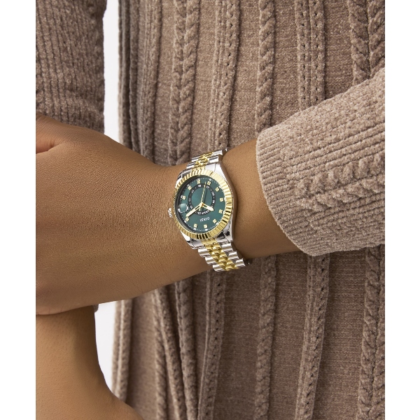 Γυναικείο ρολόι διαμέτρου 34mm με μηχανισμό QUARTZ Multifuction ακριβείας. Έχει πράσινο καντράν με χρυσούς δείκτες και λεπτομέρειες, και ένδειξη ημερομηνίας. Η κάσα του είναι από ανακυκλωμένο ατσάλι με κρύσταλλο από ορυκτό κρύσταλλο ειδικής σκλήρυνσης. Έχει μπρασελέ από ανακυκλωμένο ατσάλι και κούμπωμα ασφαλείας. Δεν είναι αδιάβροχο.