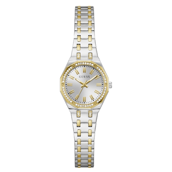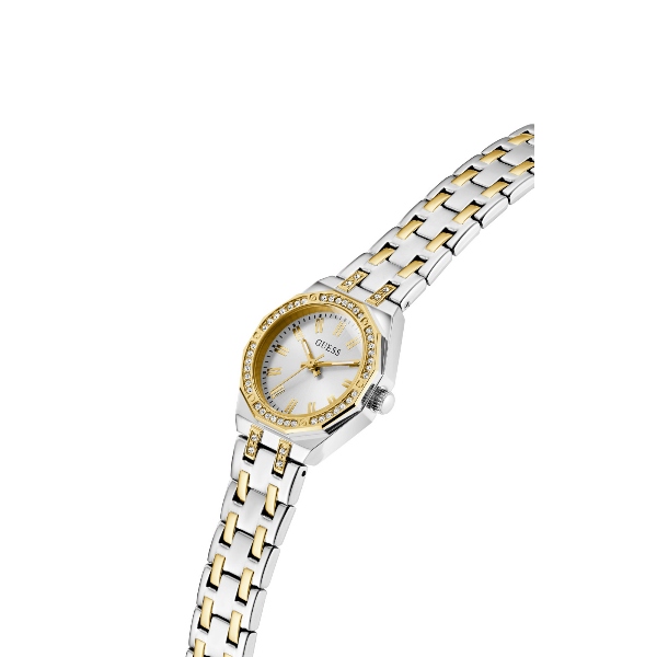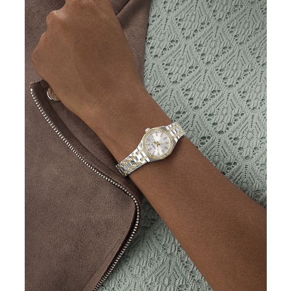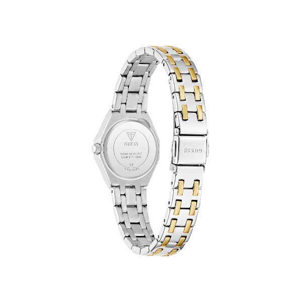 Γυναικείο ρολόι GUESS PIXIE GW0931L3 διαμέτρου 25mm, με μηχανισμό QUARTZ ακριβείας, ασημί καντράν,κάσα και μπρασελέ από ανακυκλωμένο ατσάλι και κούμπωμα ασφαλείας.