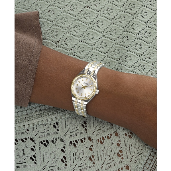 Γυναικείο ρολόι διαμέτρου 25mm με μηχανισμό QUARTZ ακριβείας. Έχει ασημί καντράν με χρυσούς δείκτες και λεπτομέρειες και είναι διακοσμημένο με πέτρες. Η κάσα του είναι ασημένια-χρυσή από ανακυκλωμένο ατσάλι και έχει κρύσταλλο από ορυκτό κρύσταλλο ειδικής σκλήρυνσης. Έχει μπρασελέ από ανακυκλωμένο ατσάλι με κούμπωμα ασφαλείας. Δεν είναι αδιάβροχο.
