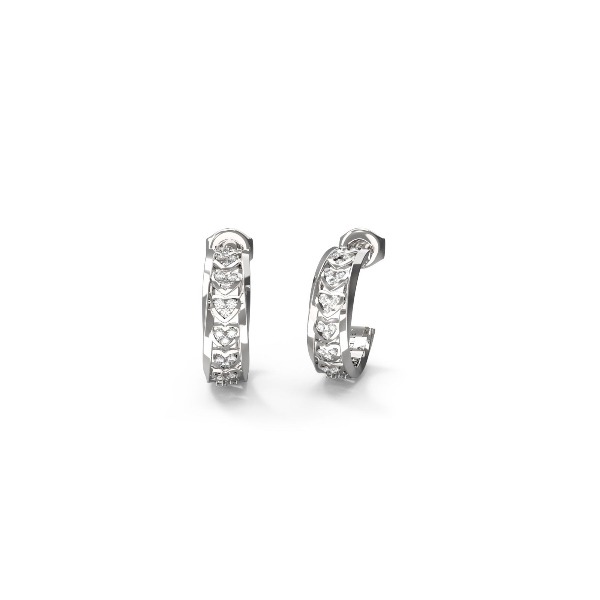 Γυναικεία σκουλαρίκια GUESS STEEL κρίκοι, ασημένιου χρώματος. Είναι διακοσμημένα με διαφανείς πέτρες ζιργκόν σε σχήμα καρδιάς και λογότυπο(1,7cm).