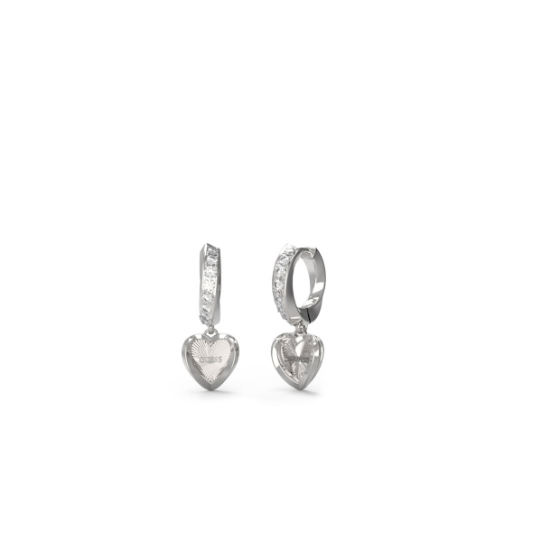 Buy It NowΓυναικεία σκουλαρίκια GUESS STEEL κρίκοι, ασημένιου χρώματος. Είναι διακοσμημένα με κρεμαστές καρδιές, με διαφανείς πέτρες ζιργκόν και λογότυπο(2cm).