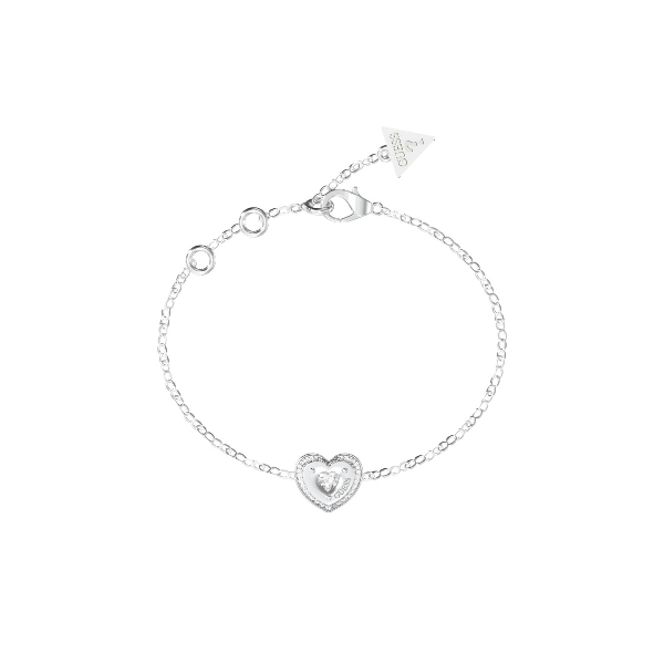 Γυναικείο βραχιόλι GUESS STEEL ασημένιου χρώματος. Είναι διακοσμημένο με σχέδιο καρδιά με λευκές πέτρες(21cm).