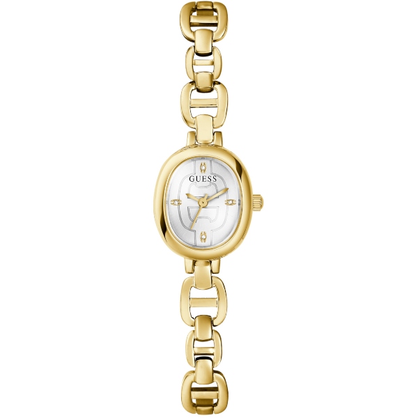Γυναικείο ρολόι GUESS VIVIAN GW0982L4 διαμέτρου 21mm, με μηχανισμό QUARTZ ακριβείας, λευκό καντράν, κάσα και μπρασελέ από ανακυκλωμένο ατσάλι.