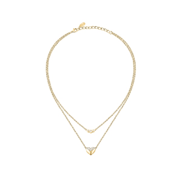 Γυναικείο κολιέ KARL LAGERFELD χρυσού χρώματος με σχέδιο διπλή αλυσίδα με καρδιά και πέτρες. Είναι κατασκευασμένο από ανοξείδωτο ατσάλι και είναι διακοσμημένο με πέτρες και λογότυπο(38/40+5cm).