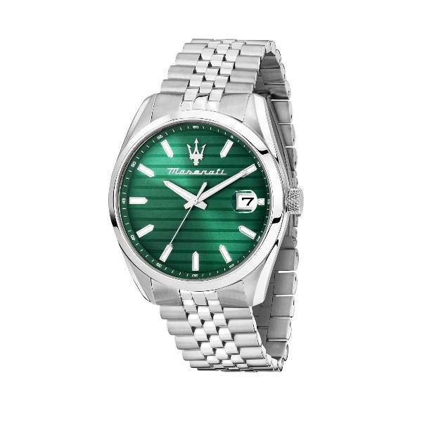 Ανδρικό ρολόι MASERATI ATTRAZIONE R8853151027 διαμέτρου 43mm, με μηχανισμό Quartz Ακριβείας, πράσινο καντράν, κάσα και μπρασελέ από ανοξείδωτο ατσάλι.