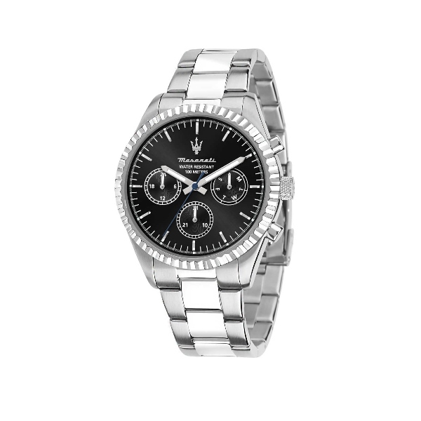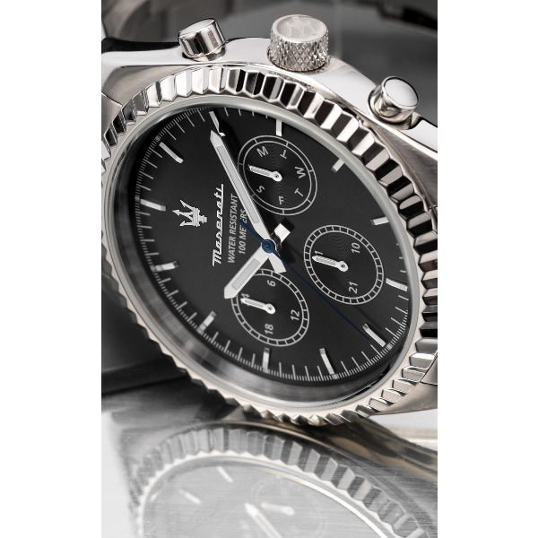 Ανδρικό ρολόι MASERATI COMPETIZIONE R8853100023 διαμέτρου 43mm, με μηχανισμό Quartz Multi-Function ακριβείας, μαύρο καντράν, κάσα και μπρασελέ από ανοξείδωτο ατσάλι.