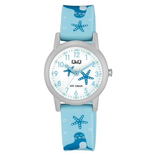 Παιδικo QQ με γαλάζιο λουράκι, ιδανικό για αγόρια και κορίτσια. Διαθέτει καντράν συνολικής διαμέτρου 32mm. Αδιάβροχο 10atm, για κολύμβηση και θαλάσσια σπορ, με δύο χρόνια εγγύηση.