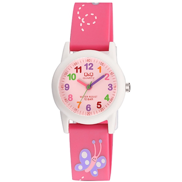 Παιδικό ρολόι χειρός Q&Q με ροζ καντράν και ροζ καουτσούκ λουράκι.