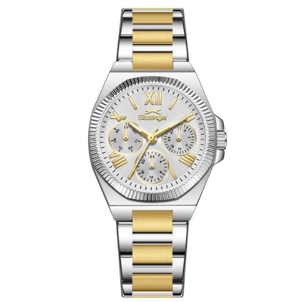 Γυναικείο ρολόι με δίχρωμο μεταλλικό μπρασελέ και καντράν σε ασημί απόχρωση. Η Slazenger είναι μία από τις μεγαλύτερες καθιερωμένες αθλητικές μάρκες στον κόσμο με σχεδόν 150 χρόνια παγκόσμιας παρουσίας. Οι συλλογές ρολογιών Slazenger είναι διαχρονικές, σπορ, κομψές και μοντέρνες για χρήση στην καθημερινή ζωή.